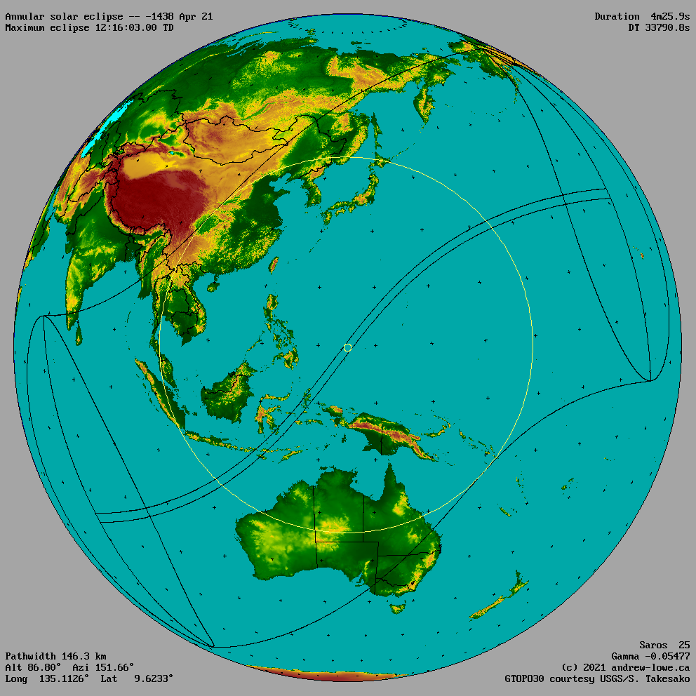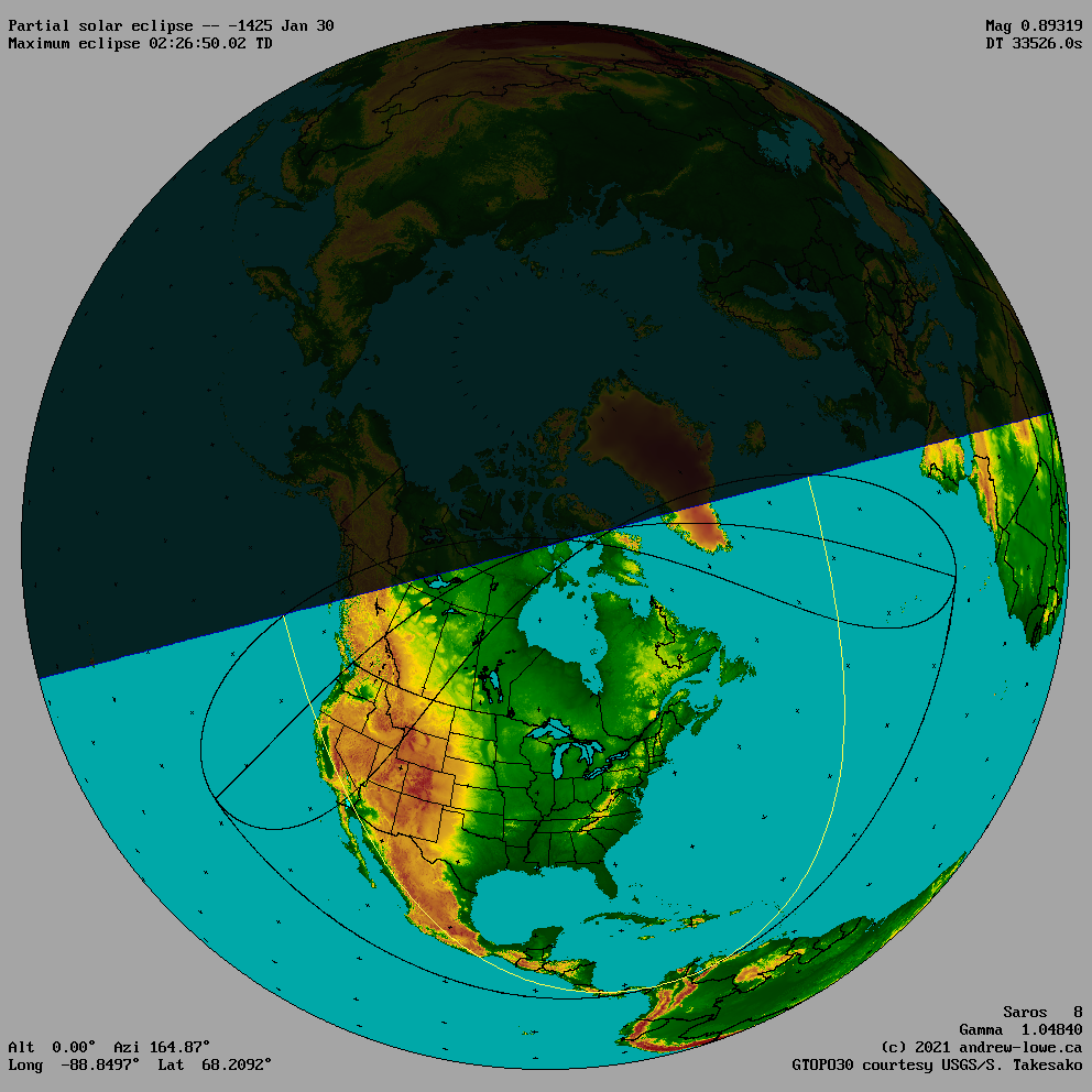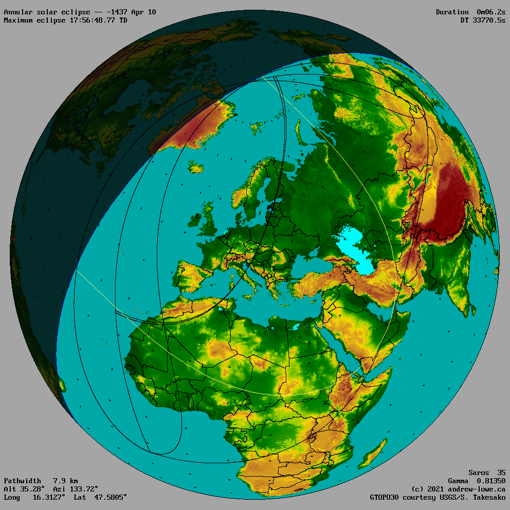 The outline of the umbra (total or annular eclipse) and the penumbra (partial eclipse) are shown for the moment of maximum eclipse.