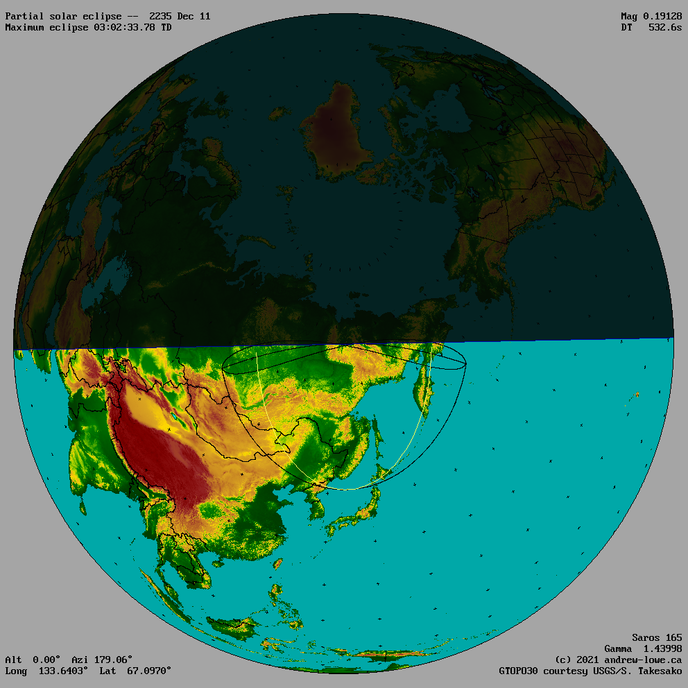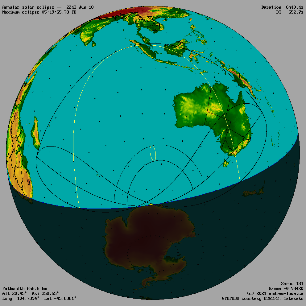 The outline of the umbra (total or annular eclipse) and the penumbra (partial eclipse) are shown for the moment of maximum eclipse.