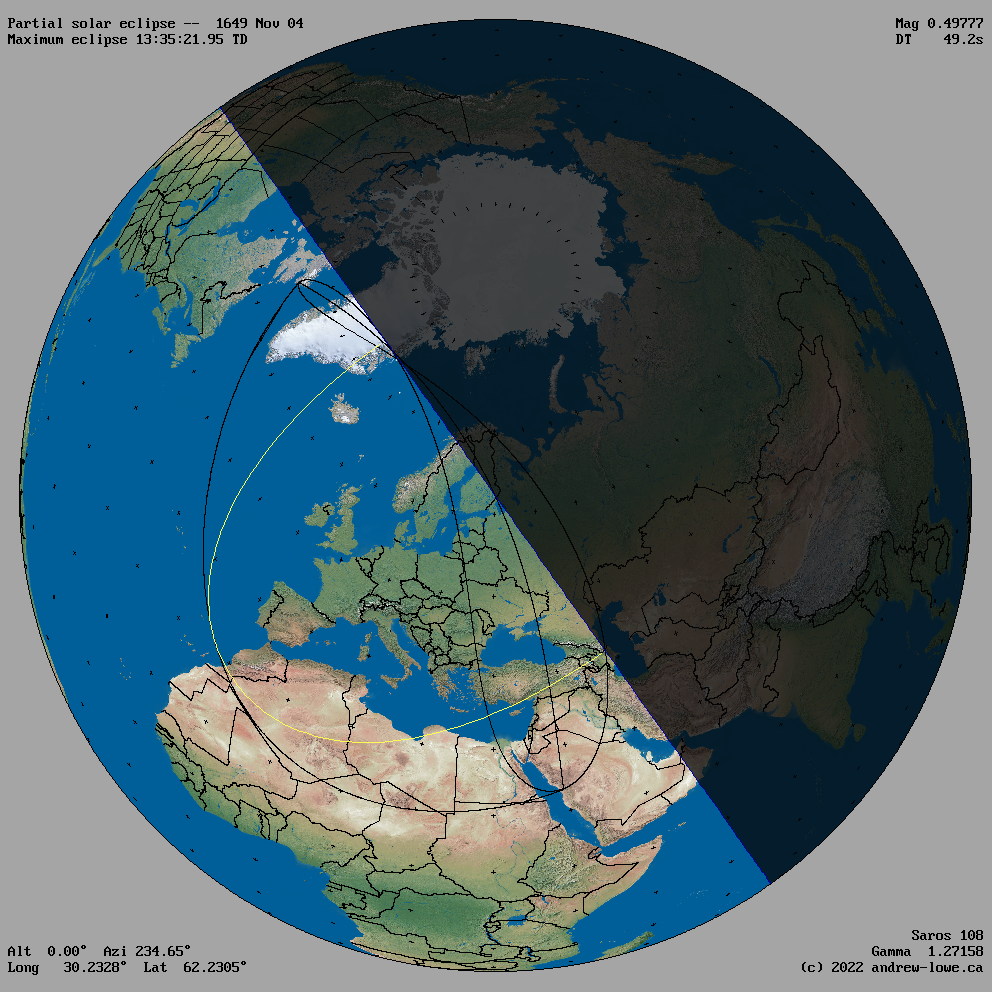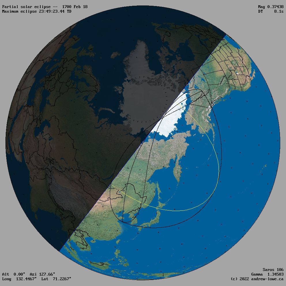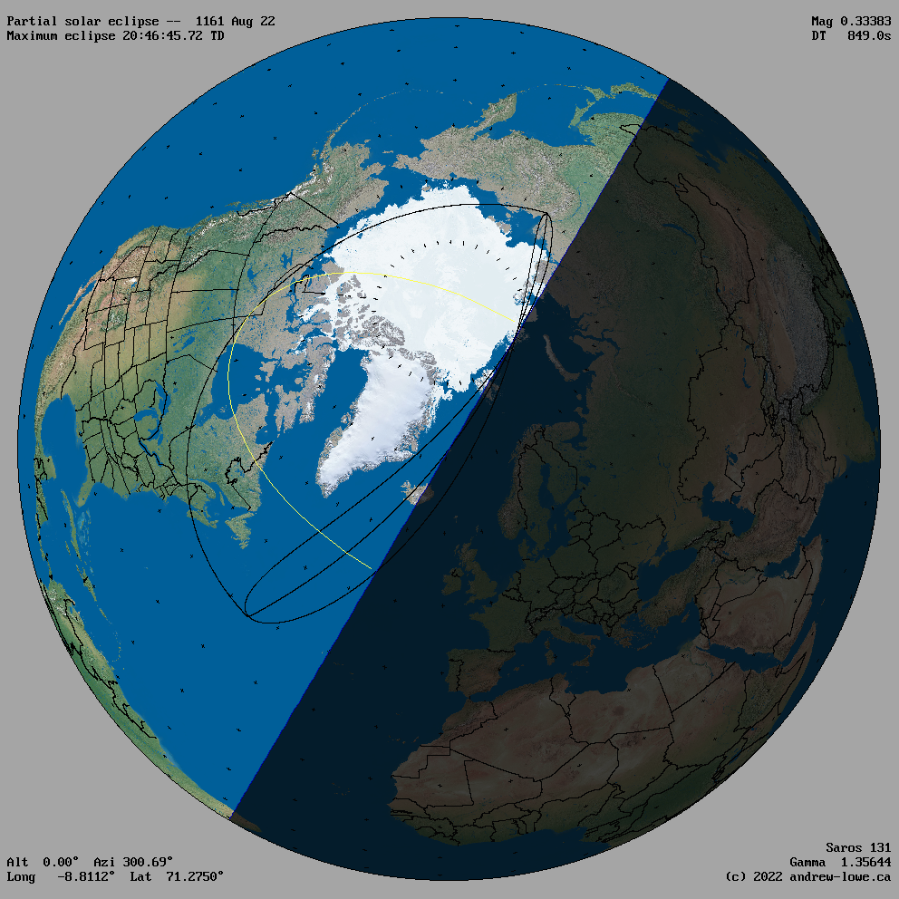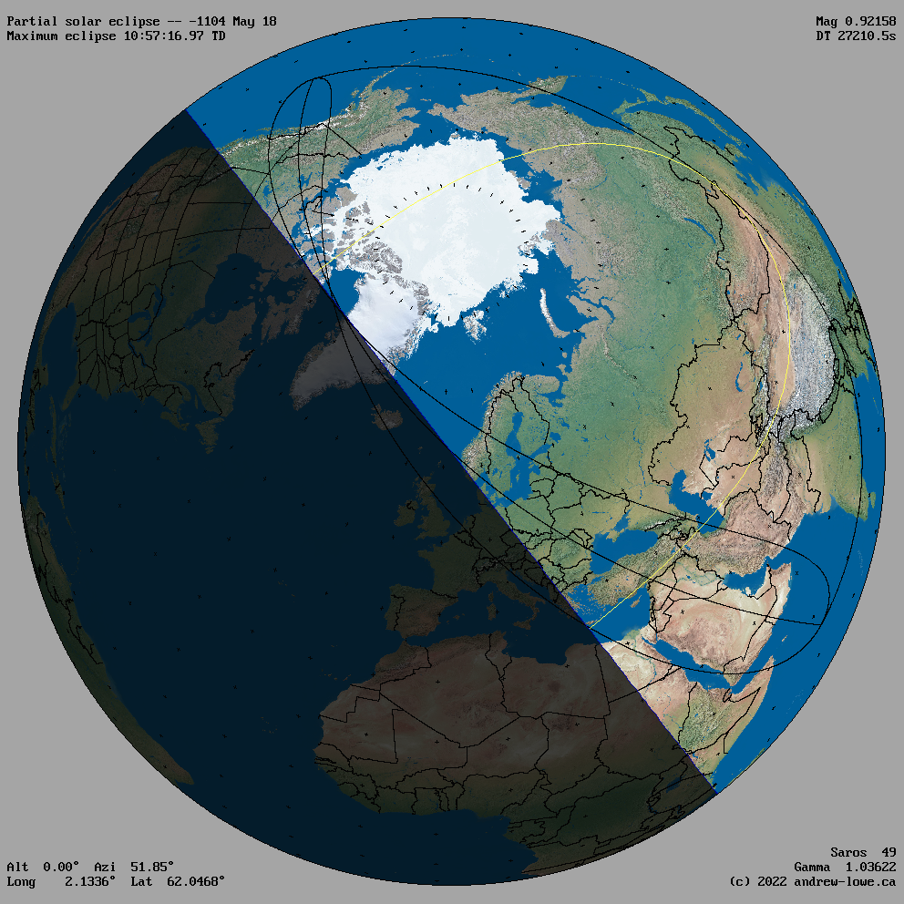 Eclipse: The date of the eclipse, in the Julian Calendar prior to October 1582. The Gregorian Calendar is used after October 1582.