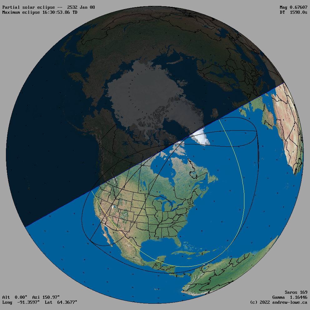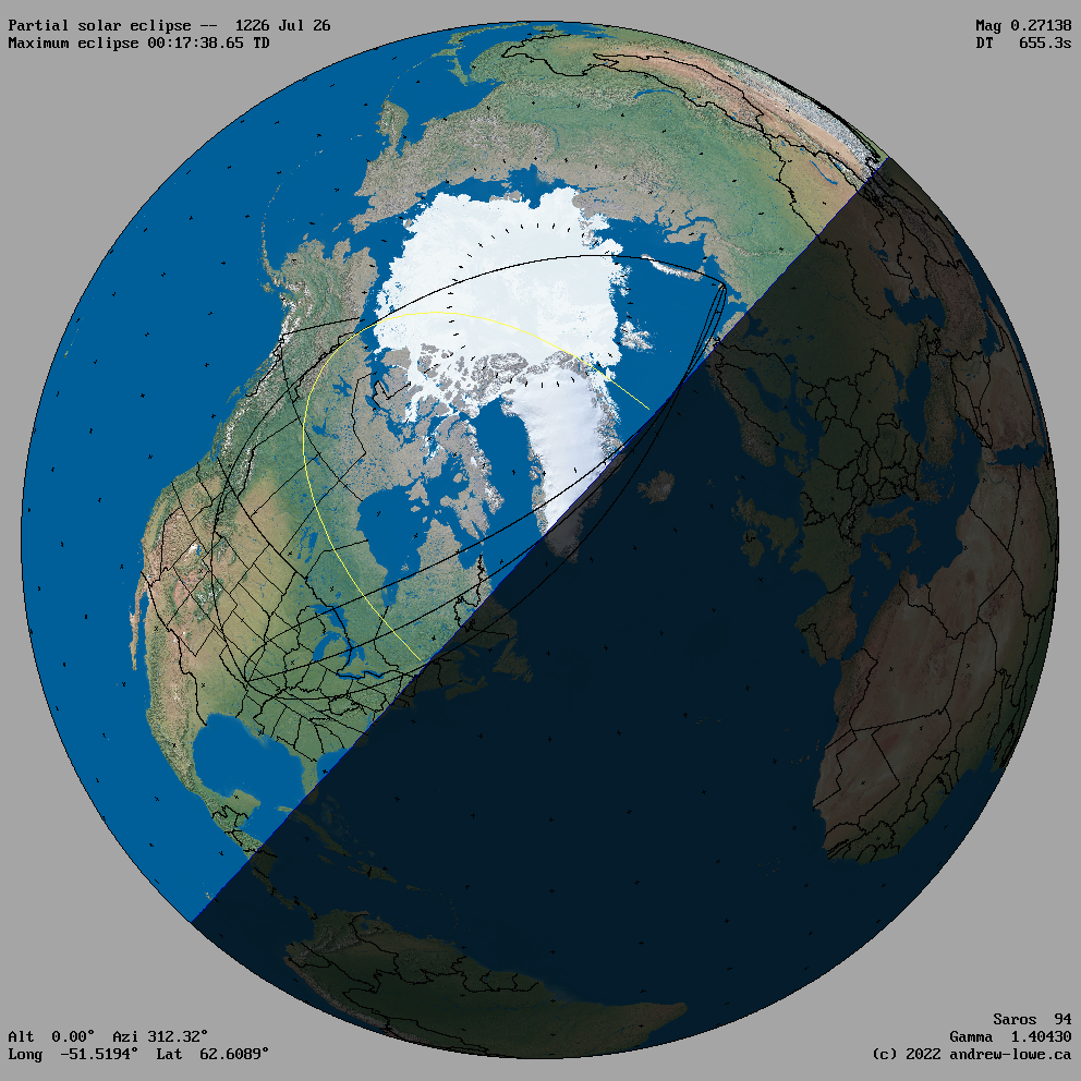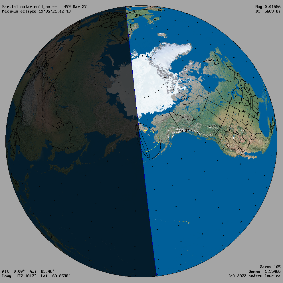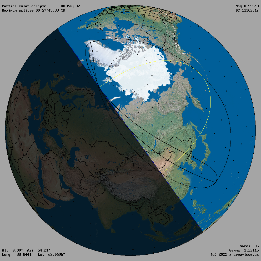 Eclipse: The date of the eclipse, in the Julian Calendar prior to October 1582. The Gregorian Calendar is used after October 1582.