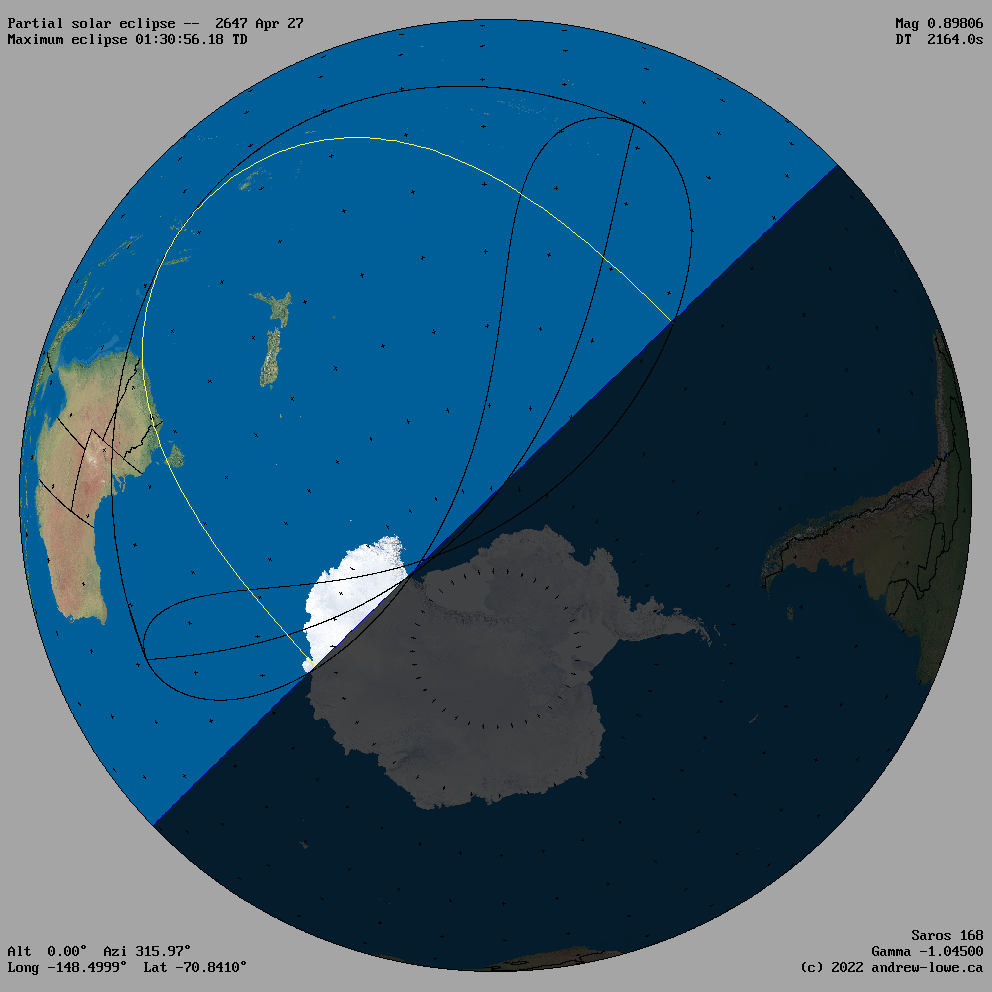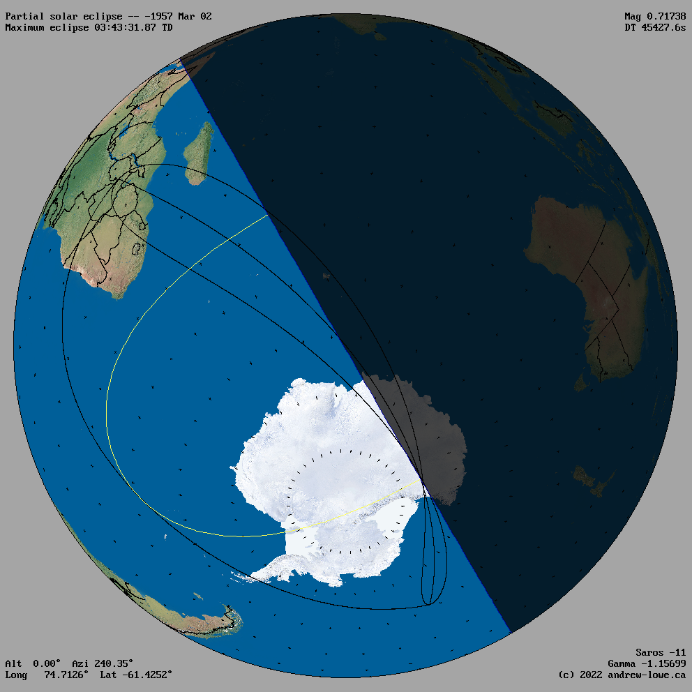 ________________________________________________________________________________________________________________________________ Eclipse Type Maximum (TD) DT Saros Gamma Magnitude Shadow Coordinates Sky Position Pathwidth Duration ________________________________________________________________________________________________________________________________ -1999 Jun 12 Total 03:13:46.71 46437.4 5 -0.26984 -33.0658° 6.0391° 74.38° 343.66° 246.5 6m37.8s -1999 Dec 05 Annular 23:44:13.31 46425.6 10 -0.23204 11.0800° -32.9427° 76.41° 20.99° 235.7 6m46.4s -1998 Jun 01 Total 18:08:15.08 46413.8 15 0.49967 83.6582° 46.1990° 59.80° 151.01° 110.5 2m14.8s -1998 Nov 25 Annular 05:56:04.90 46402.0 20 -0.90485 -143.6797° -67.8194° 24.81° 74.37° 162.1 1m14.4s -1997 Apr 22 Partial 13:19:25.95 46392.2 -13 -1.46662 0.16179 -106.2200° -60.6320° 0.00° 281.10° -1997 May 22 Partial 02:44:25.63 46390.2 25 1.32570 0.40280 -151.5231° 61.7421° 0.00° 55.37° -1997 Oct 16 Partial 08:01:24.93 46380.3 -8 1.16657 0.69596 -22.4889° 60.5881° 0.00° 265.11° -1997 Nov 14 Partial 18:47:49.24 46378.4 30 -1.51855 0.03711 -27.5593° -61.5015° 0.00° 119.95° -1996 Apr 10 Annular 13:53:51.10 46368.6 -3 -0.72264 -167.0268° -38.1861° 43.50° 321.31° 277.1 5m10.8s -1996 Oct 04 Total 23:22:34.36 46356.7 2 0.51624 38.8408° 28.7597° 58.76° 213.96° 100.5 2m04.4s -1995 Mar 30 Annular 17:23:40.22 46345.0 7 -0.06124 112.9432° -0.1329° 86.49° 150.61° 45.0 1m17.0s -1995 Sep 24 Annular 10:30:38.92 46333.1 12 -0.18667 -149.7011° -3.1382° 79.22° 28.63° 84.9 2m20.7s -1994 Mar 20 Total 03:58:38.04 46321.4 17 0.80942 -73.0217° 39.3986° 35.70° 142.48° 186.5 2m34.4s -1994 Sep 13 Annular 14:30:50.98 46309.6 22 -0.92684 116.3489° -48.2091° 21.65° 42.25° 736.7 6m57.5s -1993 Feb 08 Partial 11:41:09.85 46299.7 -11 -1.06966 0.88304 -22.8863° -62.7004° 0.00° 221.98° -1993 Mar 09 Partial 19:46:56.10 46297.8 27 1.49093 0.07496 11.5976° 61.2175° 0.00° 113.72° -1993 Aug 03 Partial 21:34:36.42 46288.0 -6 1.31131 0.42970 -166.4993° 63.4863° 0.00° 327.03° -1992 Jan 29 Total 02:33:43.97 46276.1 -1 -0.38720 -13.2281° -44.0455° 67.00° 340.43° 67.0 1m30.3s -1992 Jul 23 Annular-Total 04:02:43.49 46264.4 4 0.51795 -38.8724° 54.0060° 58.55° 196.90° 23.8 0m28.8s -1991 Jan 17 Annular 11:29:01.49 46252.5 9 0.34622 -159.9147° -3.5083° 69.77° 170.14° 155.2 5m04.7s -1991 Jul 12 Total 17:33:25.15 46240.9 14 -0.24231 106.5342° 10.0343° 76.04° 5.89° 205.2 5m50.1s -1990 Jan 06 Partial 13:08:55.19 46229.0 19 1.07513 0.82529 163.5303° 65.4319° 0.00° 167.26° -1990 Jul 02 Total 10:29:02.86 46217.3 24 -0.96251 -149.2433° -51.2003° 15.13° 2.48° 763.1 4m28.8s -1990 Nov 26 Partial 19:20:24.89 46207.4 -9 -1.25164 0.53173 -67.1352° -69.3504° 0.00° 149.55° -1989 May 23 Annular-Total 16:55:43.18 46195.7 -4 0.86151 79.6798° 72.0605° 30.13° 138.75° 45.7 0m26.9s -1989 Nov 16 Annular-Total 03:38:44.44 46183.9 1 -0.50948 -53.9224° -44.0078° 59.13° 18.52° 14.4 0m18.3s -1988 May 11 Annular 23:28:06.77 46172.1 6 0.09867 17.0216° 18.2492° 84.23° 165.17° 126.2 4m11.3s -1988 Nov 04 Total 17:46:06.84 46160.3 11 0.17690 106.6674° -0.6408° 79.81° 195.70° 147.5 4m03.5s -1987 May 01 Annular 00:28:54.97 46148.6 16 -0.67336 17.2832° -31.8885° 47.46° 340.65° 264.2 6m10.1s -1987 Oct 25 Total 09:20:18.26 46136.8 21 0.84612 -106.9116° 48.3549° 31.87° 206.63° 164.9 1m58.1s -1986 Mar 21 Partial 15:05:24.04 46127.1 -12 1.32827 0.39506 79.5973° 71.2342° 0.00° 111.39° -1986 Apr 20 Partial 02:54:18.61 46125.1 26 -1.40353 0.26448 44.8868° -71.5115° 0.00° 284.72° -1986 Sep 15 Partial 07:13:47.84 46115.2 -7 -1.27104 0.49836 -155.2175° -71.0275° 0.00° 58.00° -1985 Mar 11 Total 03:25:27.68 46103.5 -2 0.53104 -43.9310° 20.3112° 57.79° 163.37° 190.9 4m28.4s -1985 Sep 04 Annular 09:27:58.12 46091.7 3 -0.59762 -138.0144° -21.9092° 53.15° 14.52° 338.8 9m22.5s -1984 Feb 28 Total 19:50:49.41 46080.0 8 -0.19760 82.1008° -25.4779° 78.45° 345.43° 229.2 5m52.7s -1984 Aug 23 Annular 09:08:21.13 46068.2 13 0.11523 -122.8805° 24.0288° 83.24° 191.16° 223.1 7m28.0s -1983 Feb 17 Total 11:43:04.77 46056.4 18 -0.93109 -88.8415° -79.0871° 20.90° 286.37° 245.4 1m29.9s -1983 Aug 12 Annular 13:42:34.92 46044.7 23 0.83334 -167.9001° 75.4434° 33.20° 208.58° 115.9 1m14.8s -1982 Jan 08 Partial 07:26:01.91 46034.9 -10 1.14490 0.71353 -85.7571° 65.6473° 0.00° 190.63° -1982 Jul 03 Partial 17:34:02.17 46023.1 -5 -1.06614 0.89362 127.3650° -64.8072° 0.00° 340.88° -1982 Aug 02 Partial 01:39:49.16 46021.2 33 1.49983 0.06741 157.4982° 67.4942° 0.00° 351.27° -1982 Dec 28 Annular 07:37:00.22 46011.4 0 0.47071 -96.9003° 4.1526° 61.89° 189.06° 346.8 11m39.0s -1981 Jun 23 Total 10:41:01.22 45999.6 5 -0.34050 -146.5366° 3.3481° 70.11° 347.78° 239.6 6m28.6s -1981 Dec 17 Annular 07:51:02.79 45987.9 10 -0.22516 -110.3618° -35.0216° 76.80° 16.38° 220.1 6m22.9s -1980 Jun 12 Total 01:12:57.84 45976.1 15 0.42509 -19.6817° 44.9794° 64.62° 157.19° 90.8 2m00.3s -1980 Dec 05 Annular 14:31:22.83 45964.5 20 -0.90203 82.2697° -72.0303° 25.18° 77.51° 127.1 0m57.7s -1979 May 02 Partial 19:41:29.98 45954.6 -13 -1.55386 0.01165 147.6613° -60.9239° 0.00° 289.71° -1979 Jun 01 Partial 09:16:29.11 45952.6 25 1.24560 0.54358 99.5743° 62.3481° 0.00° 46.53° -1979 Oct 26 Partial 16:52:16.69 45942.8 -8 1.16878 0.69154 -165.7117° 60.7641° 0.00° 255.84° -1979 Nov 25 Partial 03:40:19.10 45941.0 30 -1.51723 0.03869 -171.5107° -62.1136° 0.00° 129.51° -1978 Apr 21 Annular 20:17:30.66 45931.1 -3 -0.80603 98.0409° -40.5953° 36.03° 320.69° 314.7 4m59.9s -1978 Oct 16 Total 08:01:32.19 45919.3 2 0.52342 -93.7391° 24.8254° 58.29° 212.61° 84.2 1m46.8s -1977 Apr 11 Annular 00:16:42.68 45907.7 7 -0.01355 8.7823° 0.3765° 89.23° 330.31° 25.7 0m43.6s -1977 Oct 05 Annular 18:42:41.72 45895.8 12 -0.17509 85.0190° -6.9254° 79.88° 29.65° 104.4 2m53.6s -1976 Mar 30 Total 11:24:55.15 45884.2 17 0.743