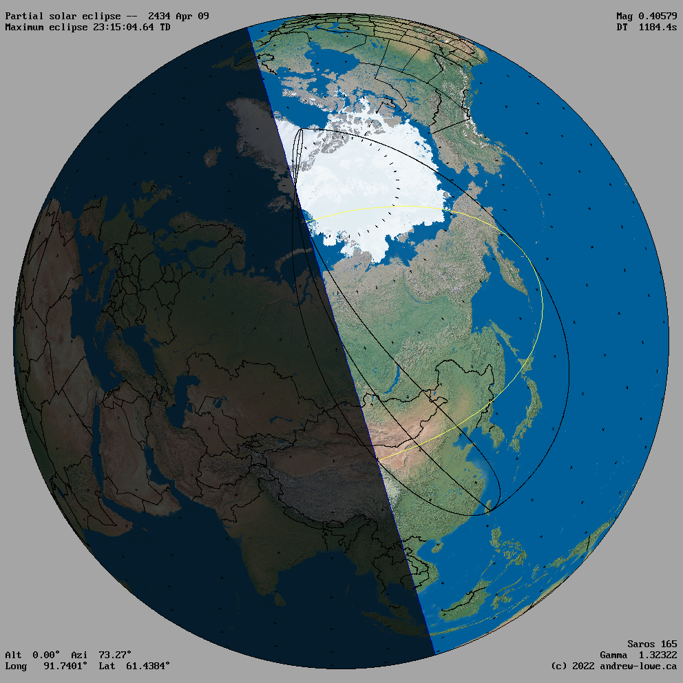 The full series of the VSOP87 solar theory and the ELP-2000/82 lunar theory have been employed to compute the solar and lunar coordinates. For the calculation of the total and annular phases (umbral cone), the value k = 0.272274 for the Moon's radius was adopted. For the partial phases (penumbral cone), the value k = 0.272481 was used.