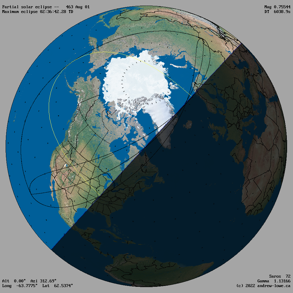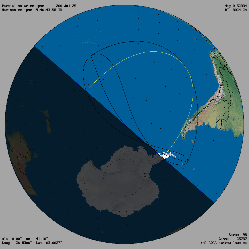 Shadow Coordinates: For central eclipses, the longitude and latitude of the center of the shadow on the Earth's surface at maximum eclipse (longitudes to the west of Greenwich are negative, longitudes east of Greenwich are positive). For non-central eclipses, the coordinates refer to the point on the Earth's surface closest to the shadow at maximum eclipse.