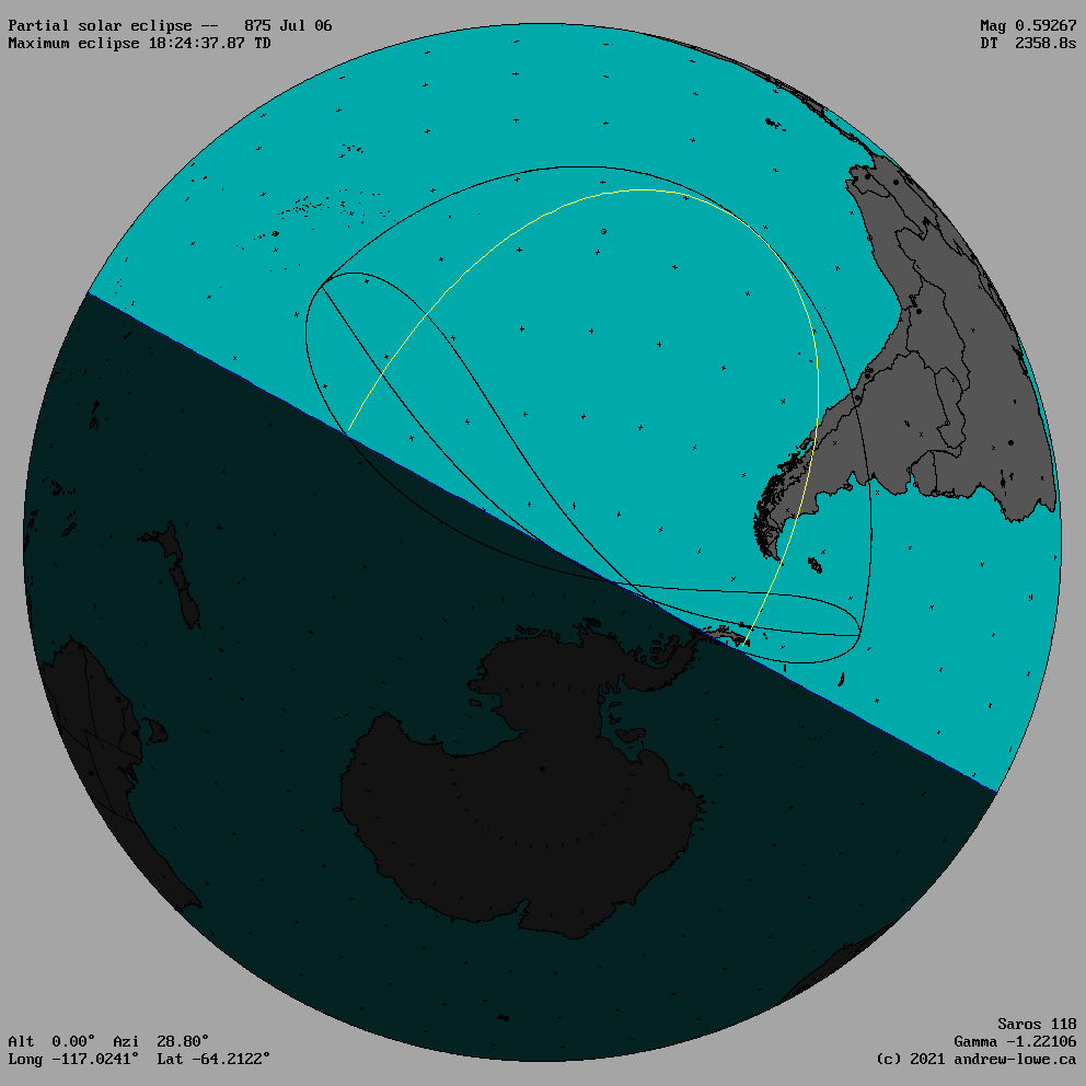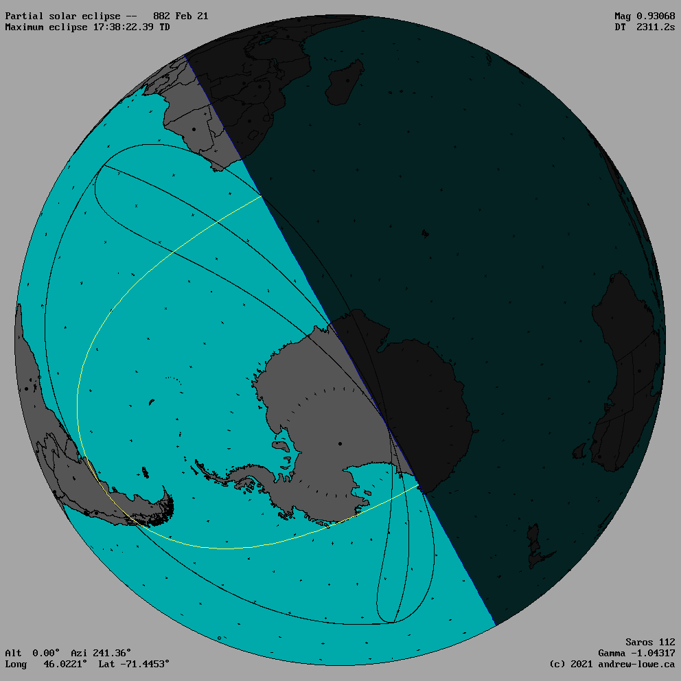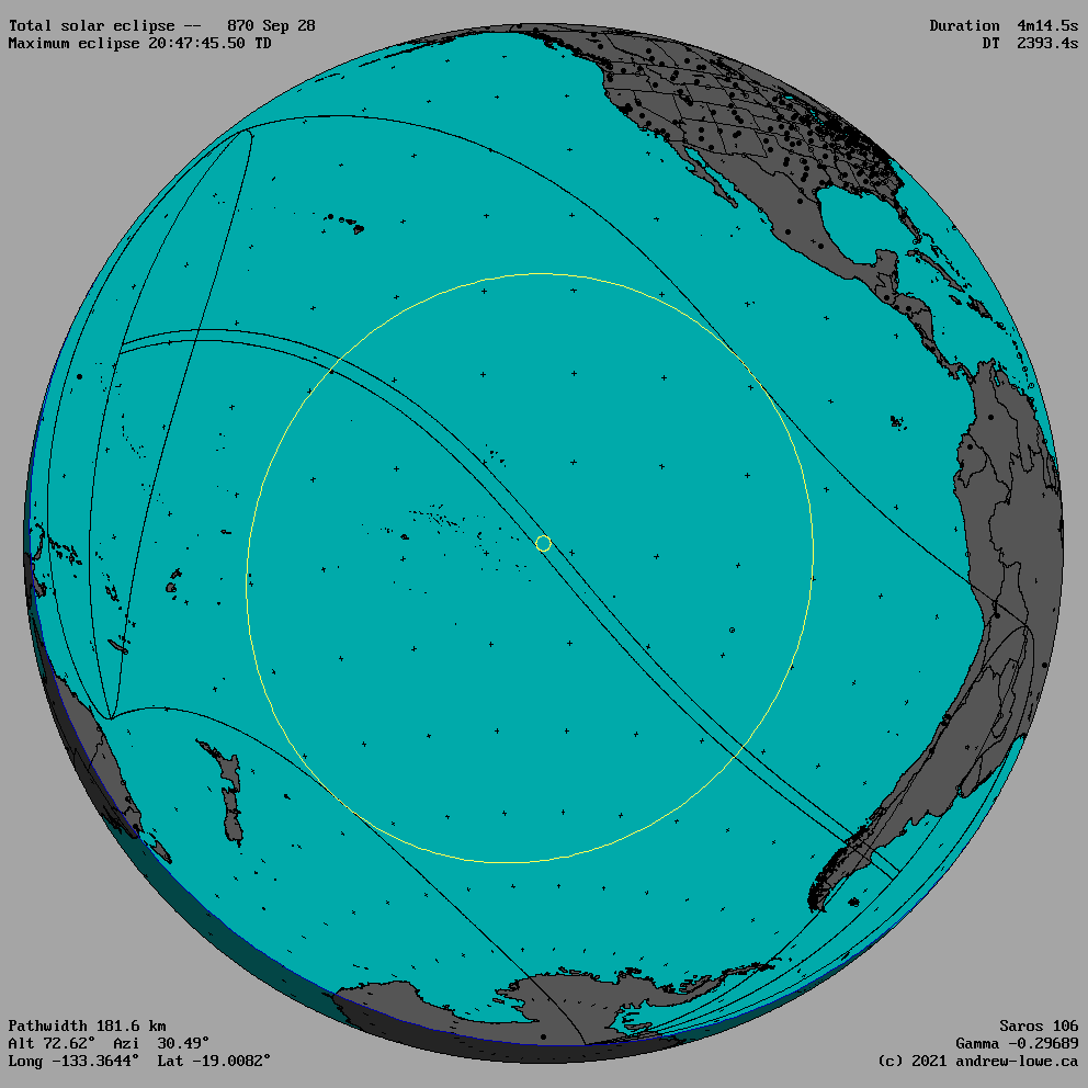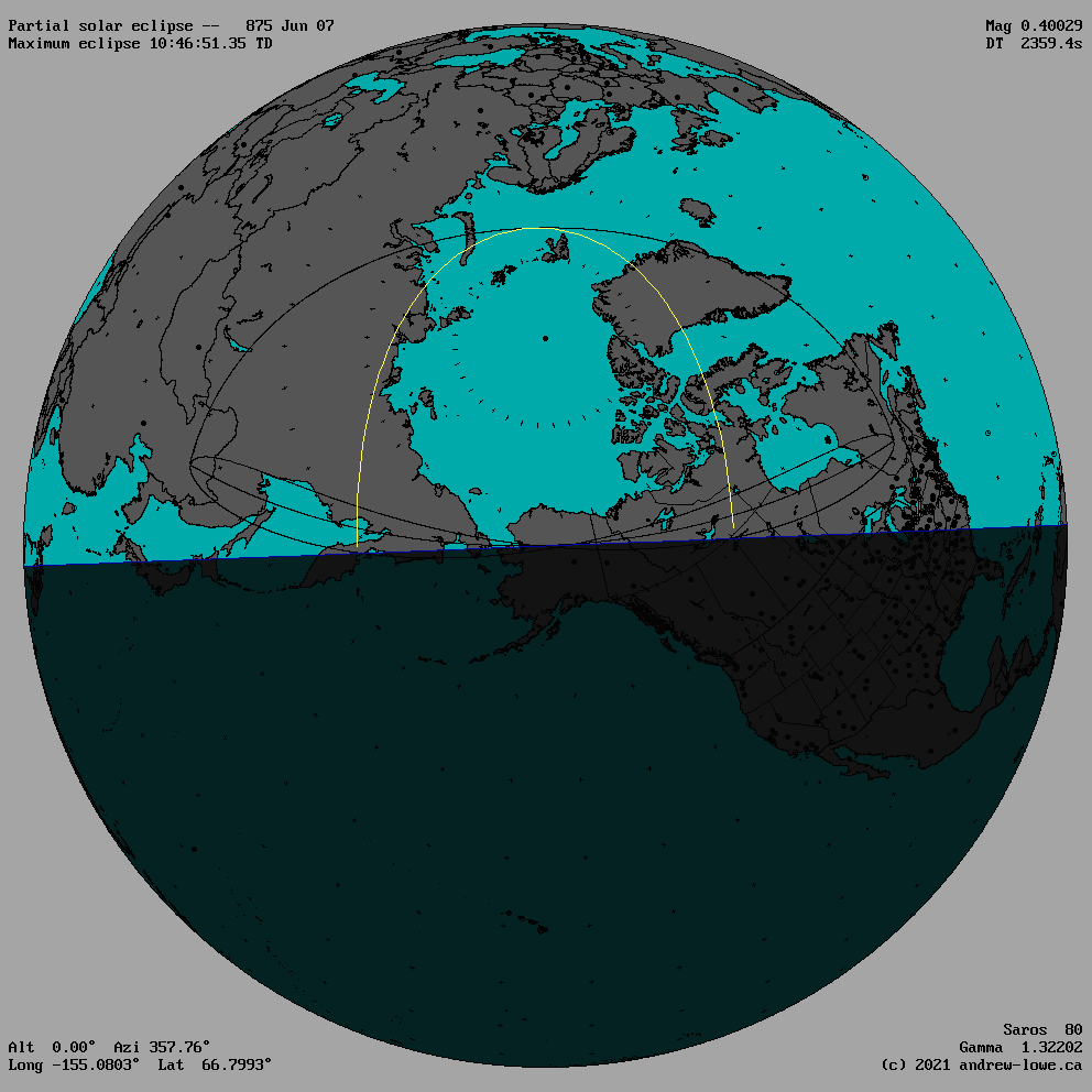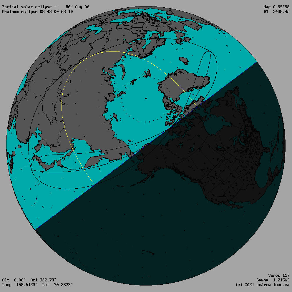 The outline of the umbra (total or annular eclipse) and the penumbra (partial eclipse) are shown for the moment of maximum eclipse.