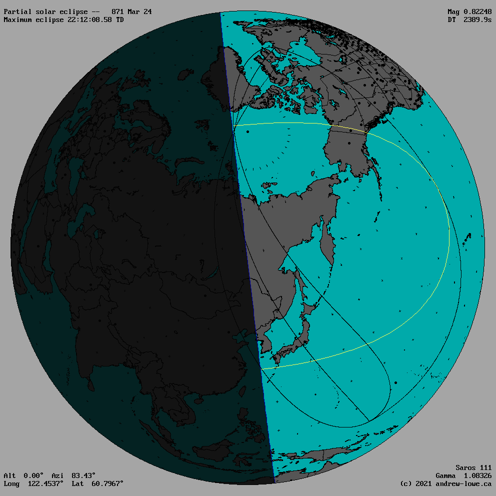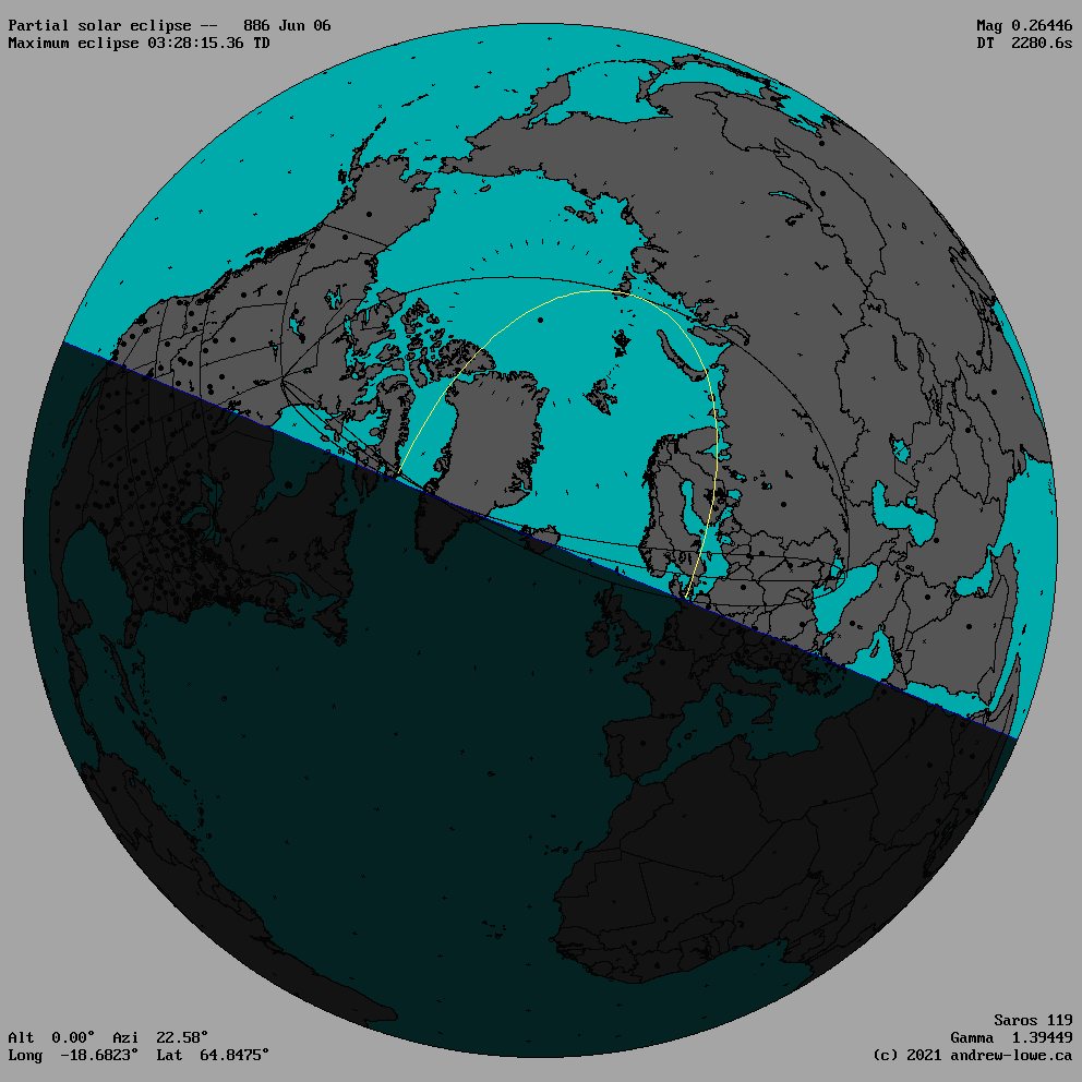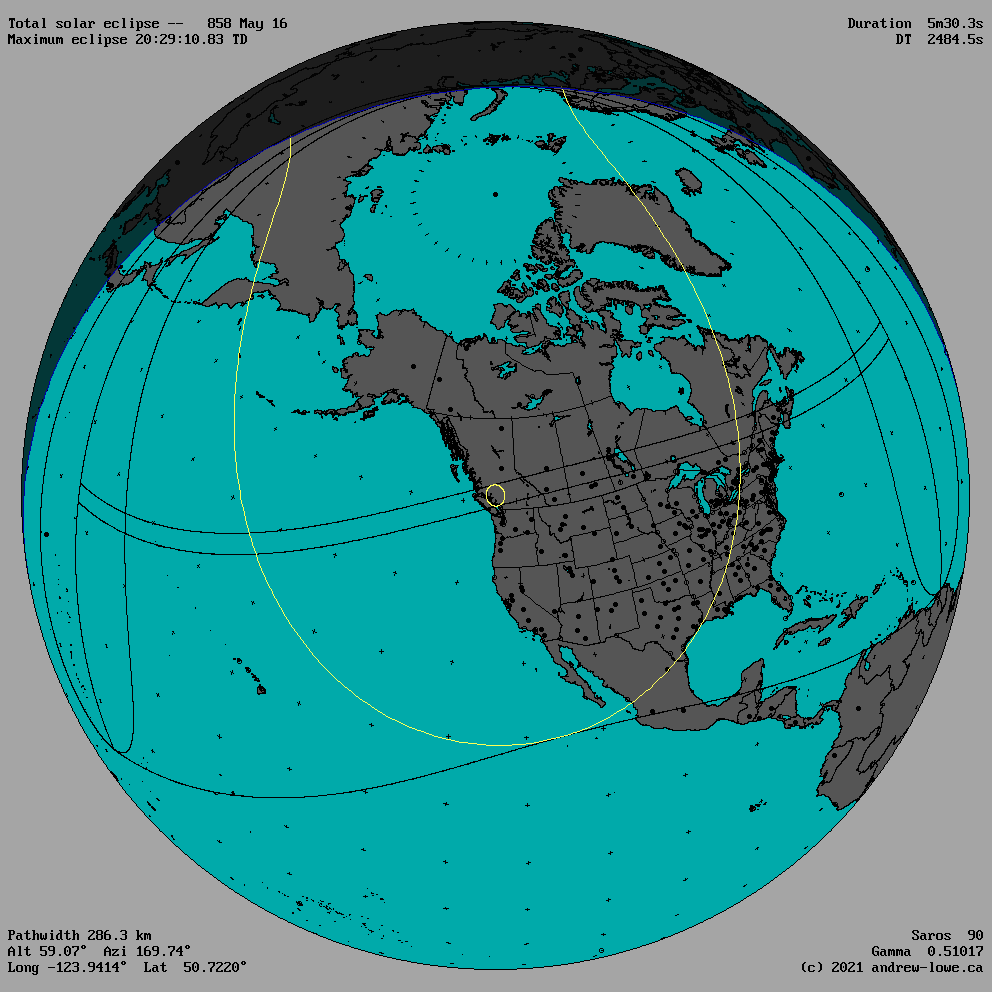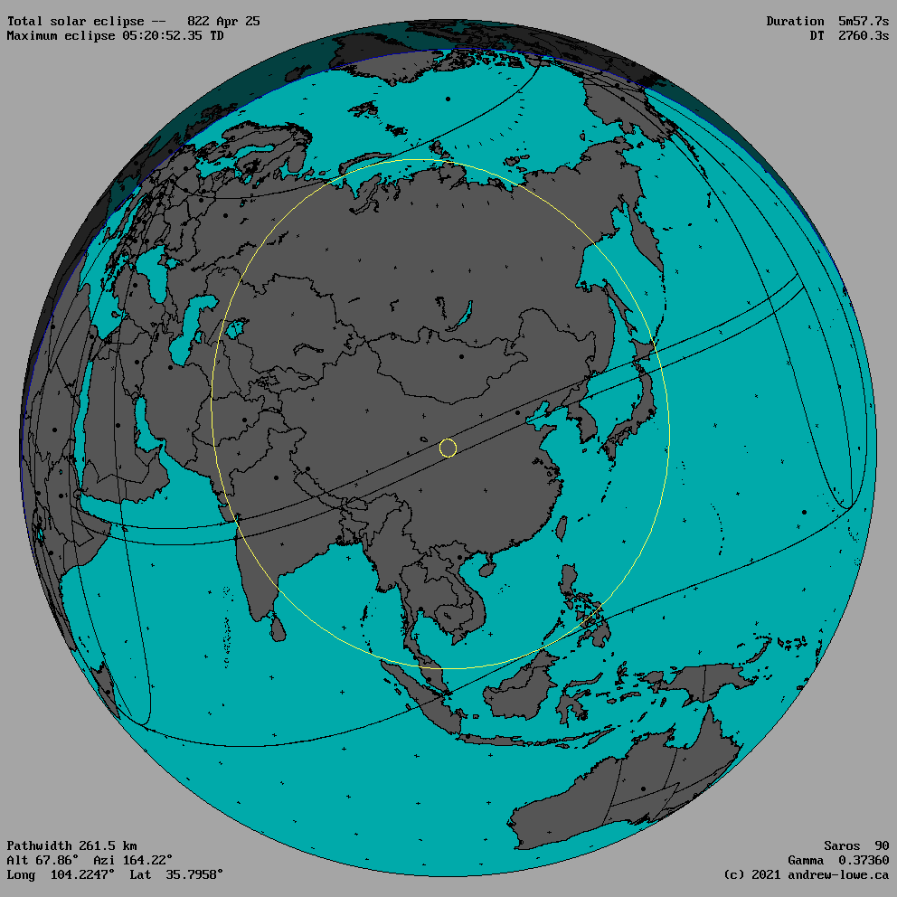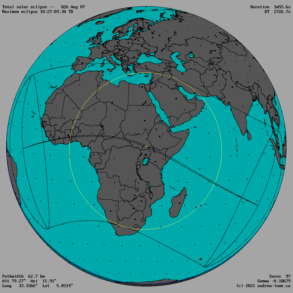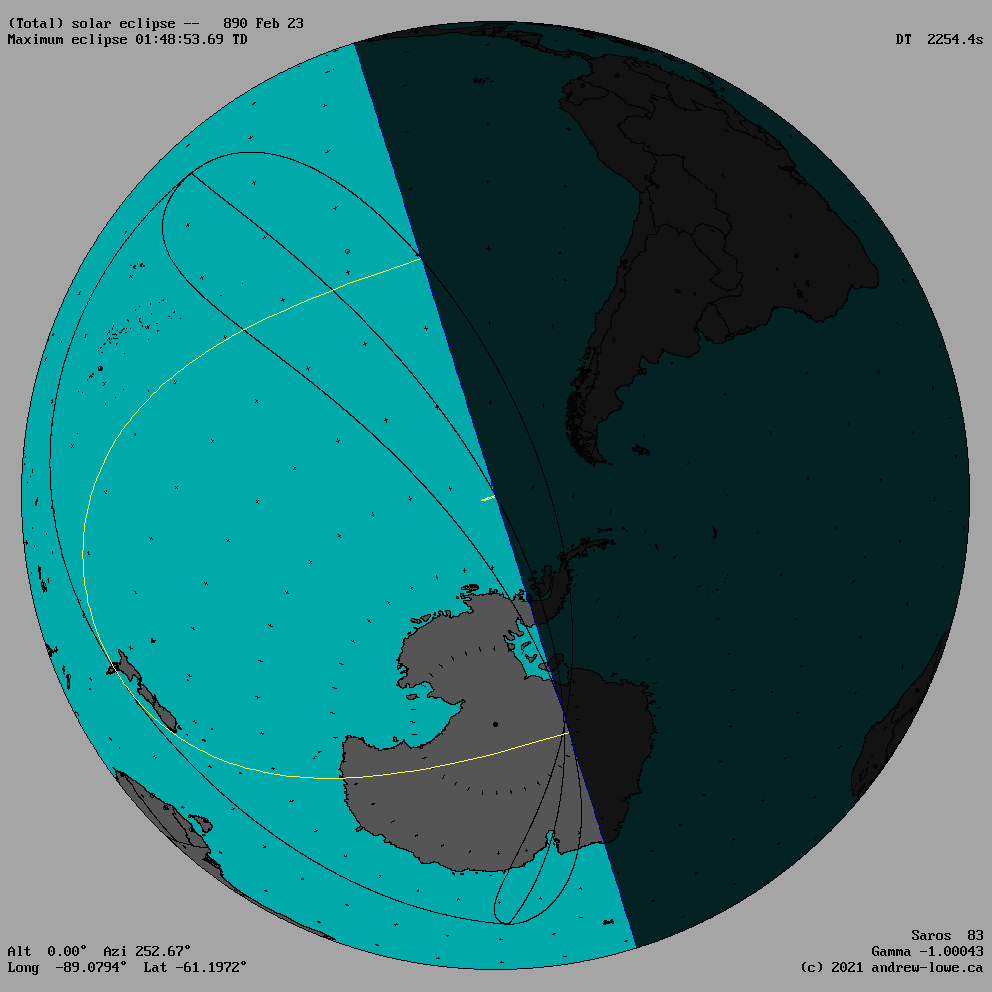 The outline of the umbra (total or annular eclipse) and the penumbra (partial eclipse) are shown for the moment of maximum eclipse.