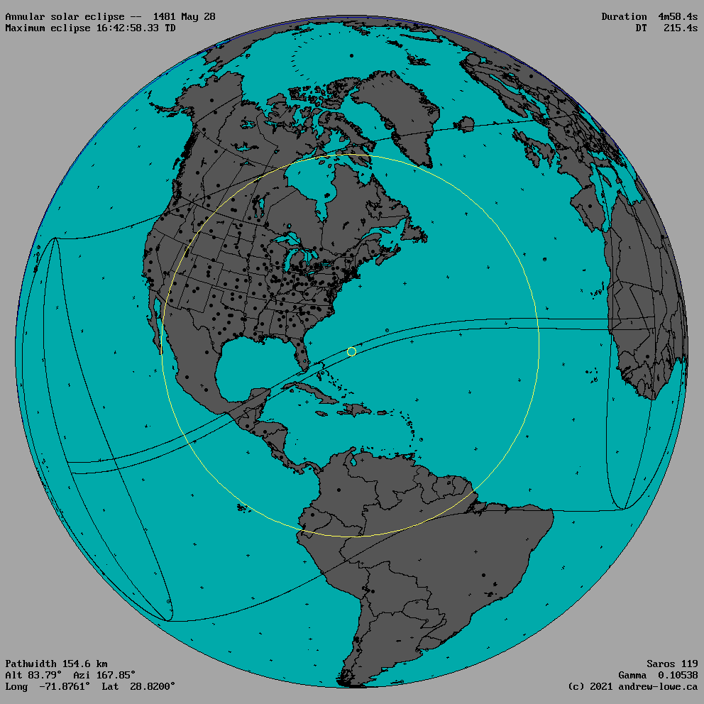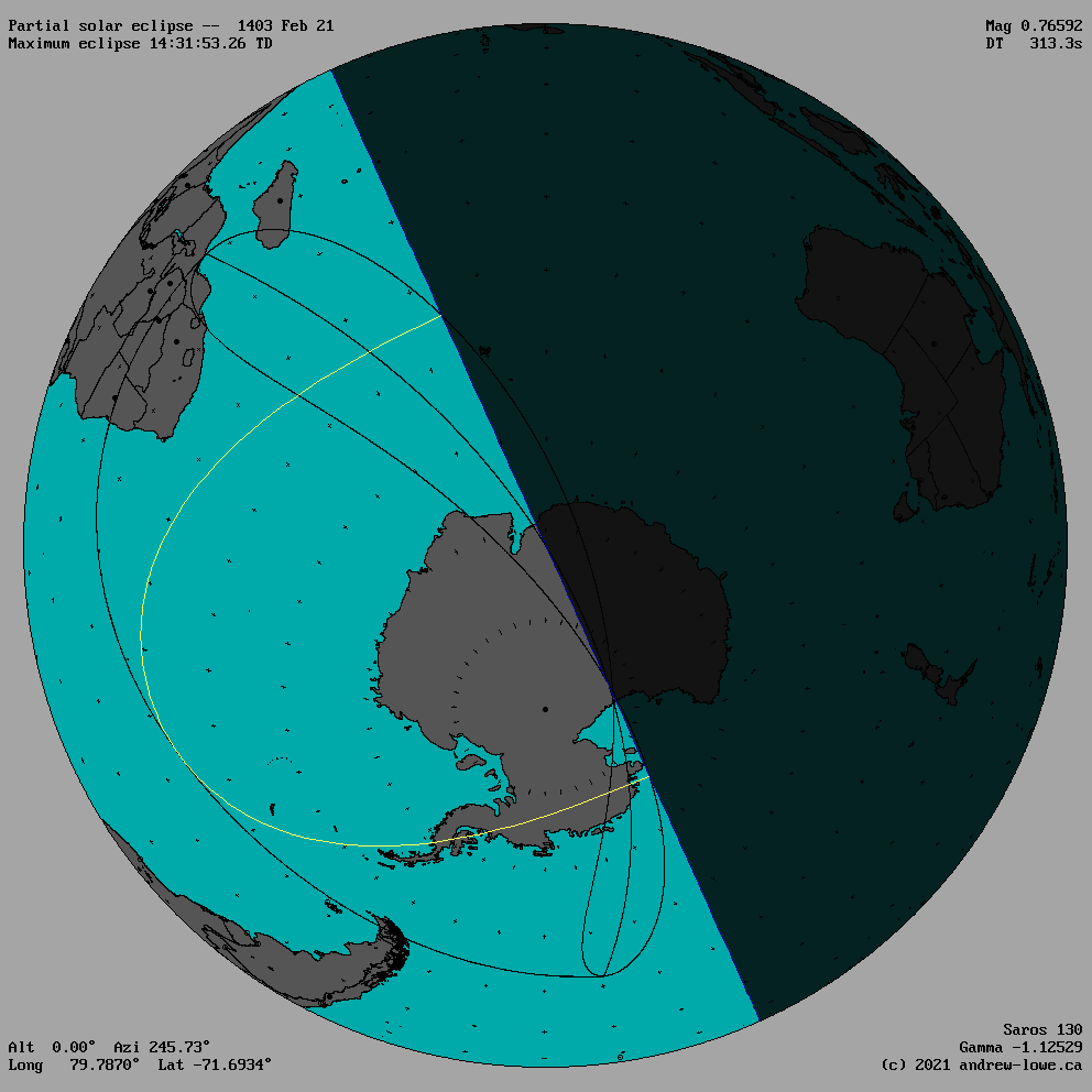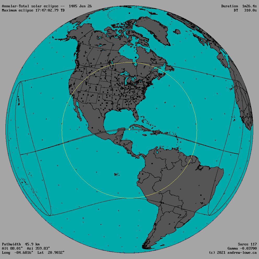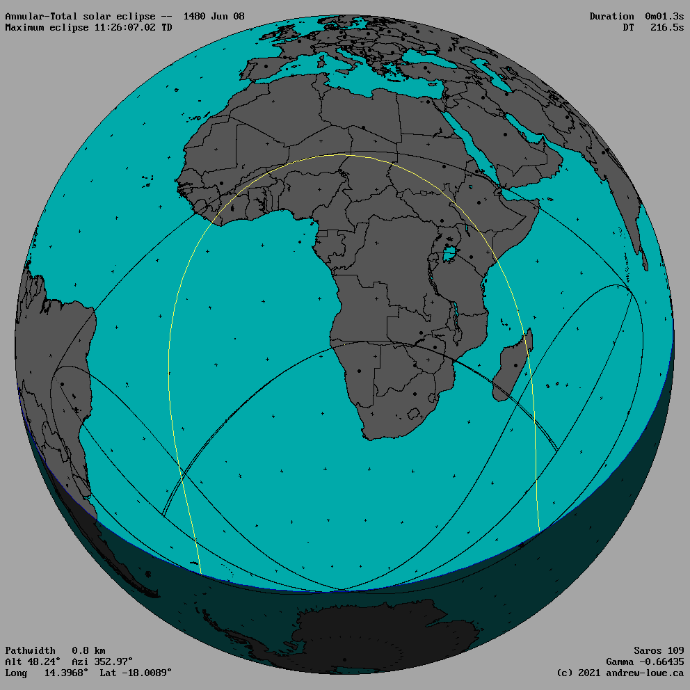 The outline of the umbra (total or annular eclipse) and the penumbra (partial eclipse) are shown for the moment of maximum eclipse.