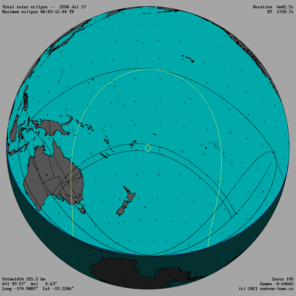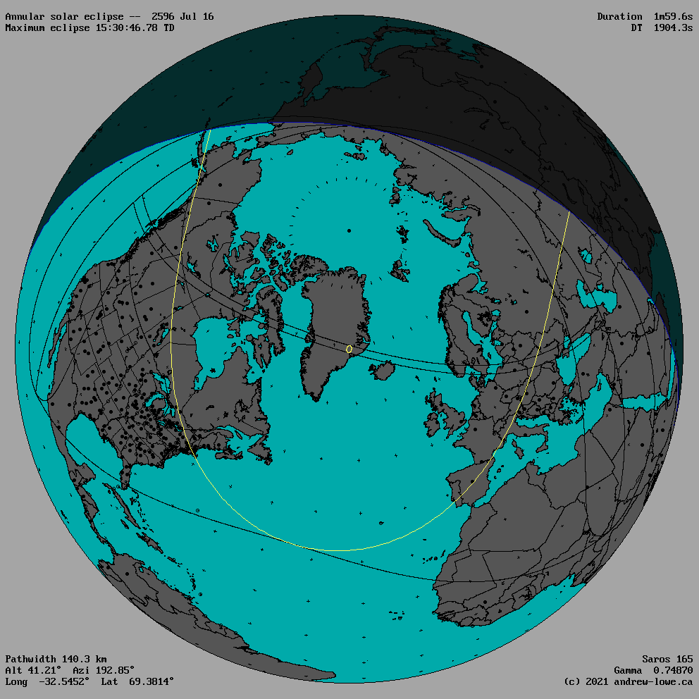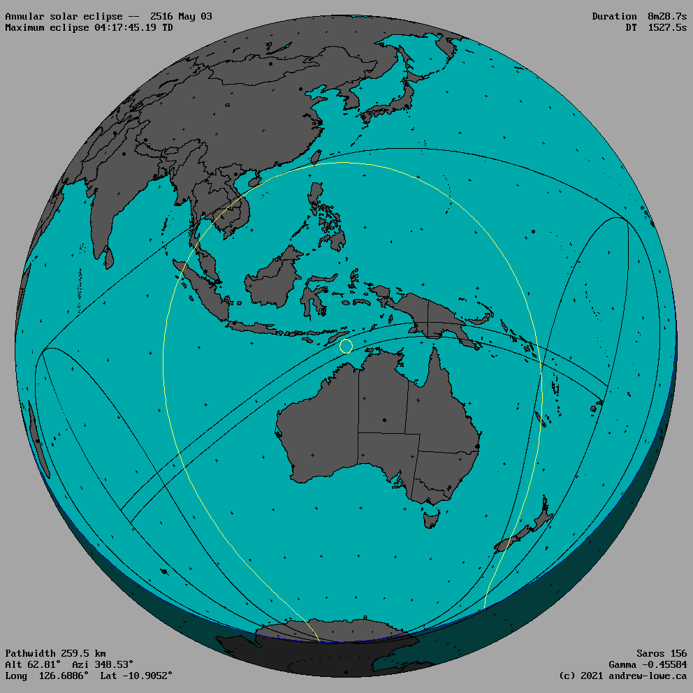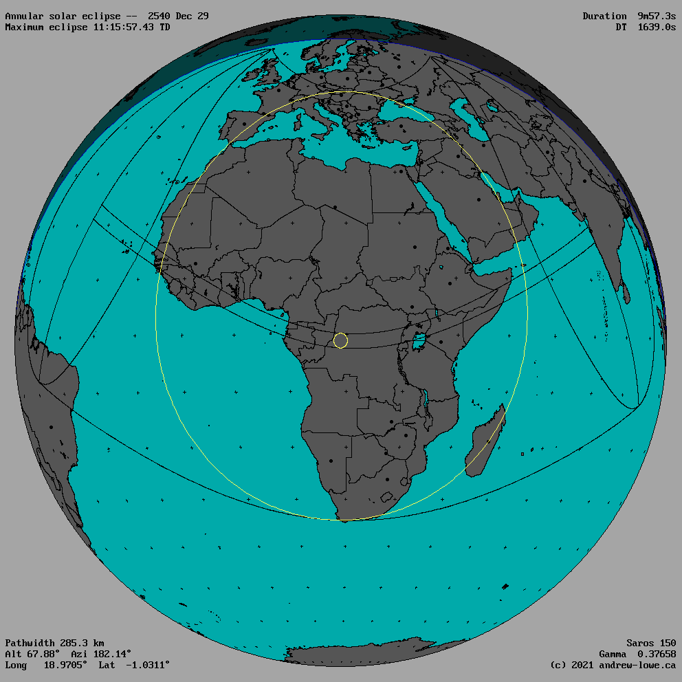 The outline of the umbra (total or annular eclipse) and the penumbra (partial eclipse) are shown for the moment of maximum eclipse.